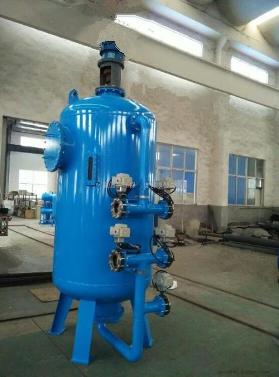 該型過濾器過濾時濾液高進低出,反洗時反洗 水低進高出,反洗水不間斷,清水消耗量大;攪拌 槳葉采用標準直葉片或斜葉片,對濾料傷害大,槳 葉一般不反轉,使纖維球和水流同向旋轉運動,導致反洗水對濾料沖洗力不大,濾料不易洗凈。