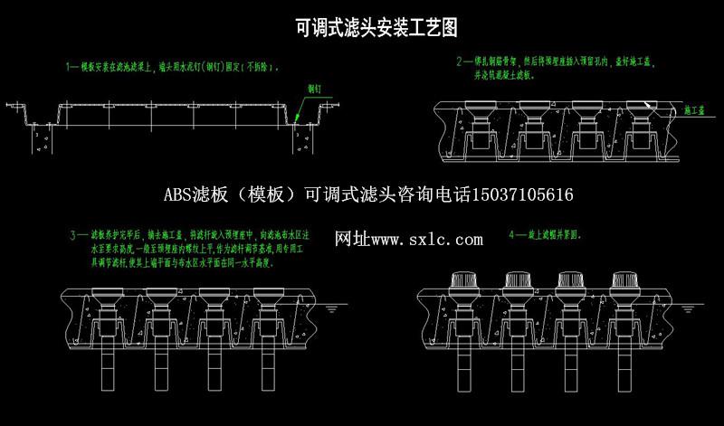 水廠濾池氣水反沖洗濾池常用的濾板有預制濾板和現(xiàn)澆整體濾板兩種:濾頭分為固定式和可調式兩種.固定式適應于預制濾板:可調式長柄濾頭特別適應于現(xiàn)澆濾板.也適應于預制濾板.QSK-ll型可調式長柄濾頭原料采用高強度ABS顆粒樹脂(簡稱ABS工程塑料)經(jīng)高溫熱溶由精密磨具成型。可調式濾頭主要用:濾帽、濾桿、預埋座組成,濾桿上設有調節(jié)螺紋,可供上下調節(jié);且設有調節(jié)瓣與預埋座內調節(jié)瓣防脫條結合,可控制濾桿調節(jié)精度,同時固定其位置。